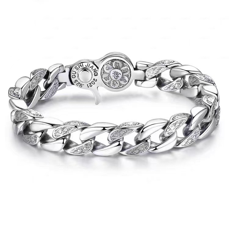 The bracelet features a Cuban link chain design, often with carved Sanskrit words or symbols like the Six-Character True Words (Om Mani Padme Hum) or Vajra symbols, adding a cultural or spiritual element. It typically includes a safety buckle or lobster claw clasp for secure fastening.